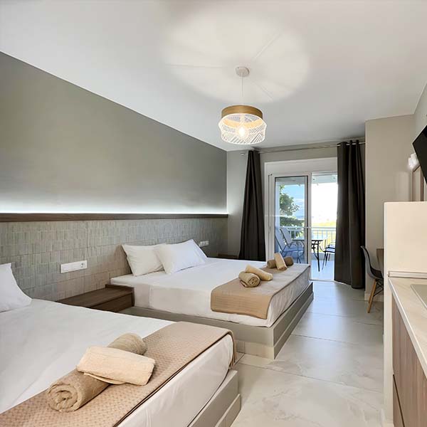 +30 697 013 9658Our accommodation is located in a peaceful, green area in Sarti, Halkidiki, just 300 meters from the crystal-clear sea.